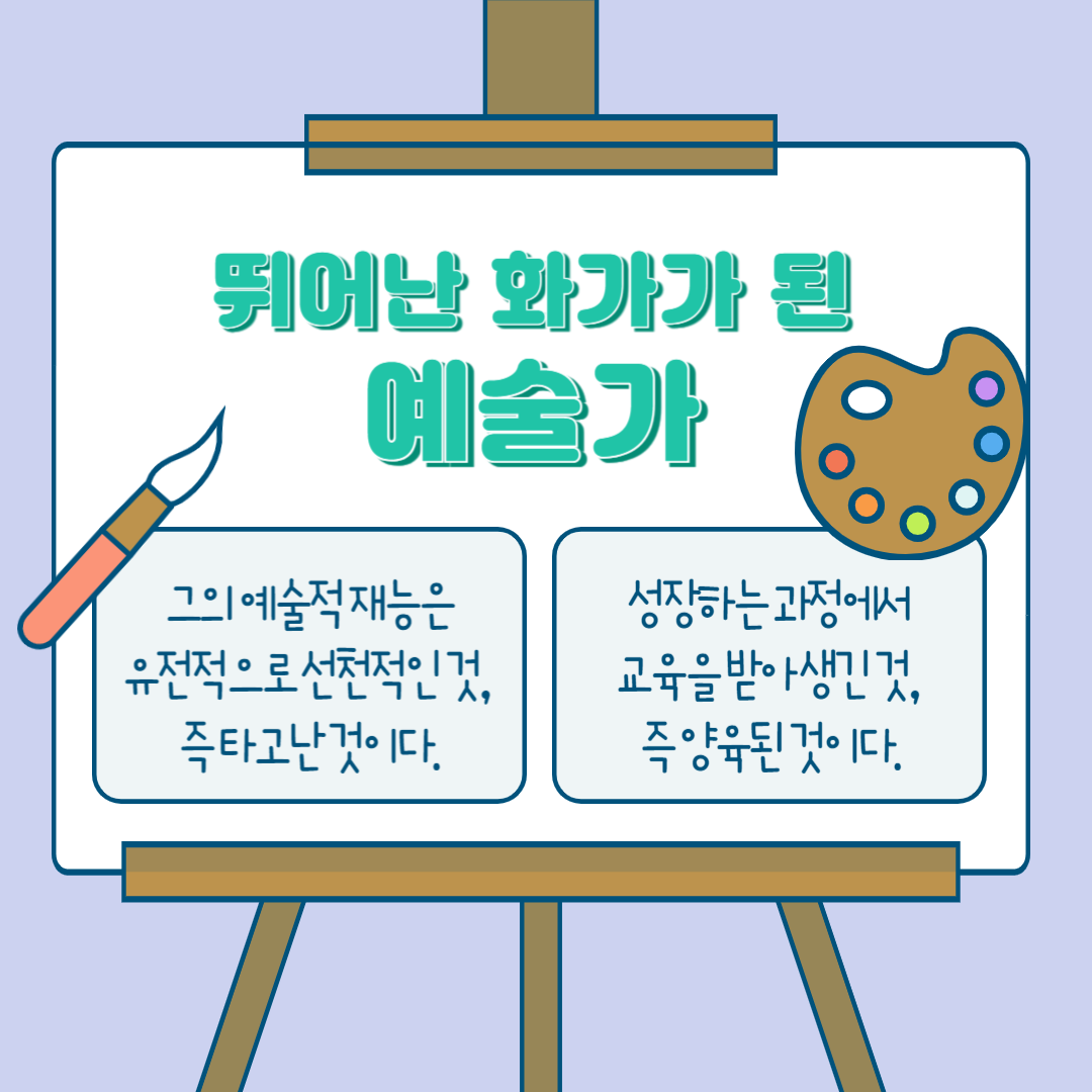 "Nature vs. Nurture”은 인간 발달에 미치는 유전적 요인(Nature, 타고나는 것)과 환경적 요인(Nurture, 길러지는 것) 중 어느 것이 더 중요한 역할을 하는가?"에 대한 논의를 의미합니다. 한 예술가가 뛰어난 화가가 되었을 때, 그의 예술적인 재능은 선천적으로 유전된 것이라고 봐야할까요, 아니면 그가 성장하는 과정에서 교육과 같은 환경적 요인의 영향을 받았다고 봐야할까요?