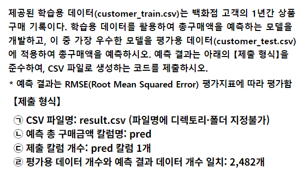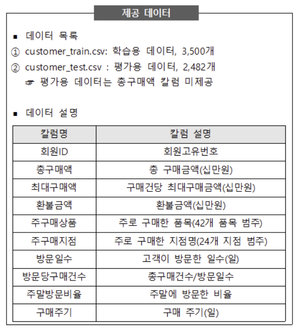 - 학습용 데이터 : customer_train.csv (백화점 고객의 1년간 상품 구매 기록)