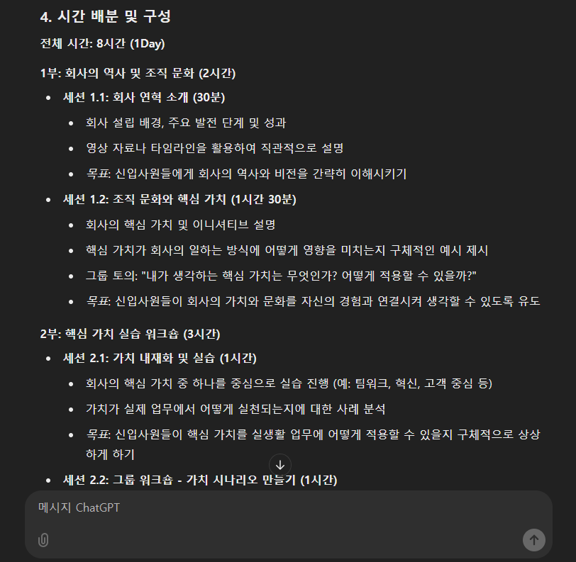 이제 ChatGPT가 제공한 초안을 검토할 차례입니다. GPT는 우리가 참고할 초안을 제공할 뿐, 조직의 니즈와 학습자의 특성 등을 정확하게 이해하고 있는 것은 기업교육 담당자이니 조직 및 학습자의 상황에 적합한지, 각 세션에 할당된 시간이 적절한지, 각 세션의 활동 내용/학습목표 중 조정이 필요한 부분은 없는지 면밀히 검토하는 과정을 반드시 거쳐야 합니다.
