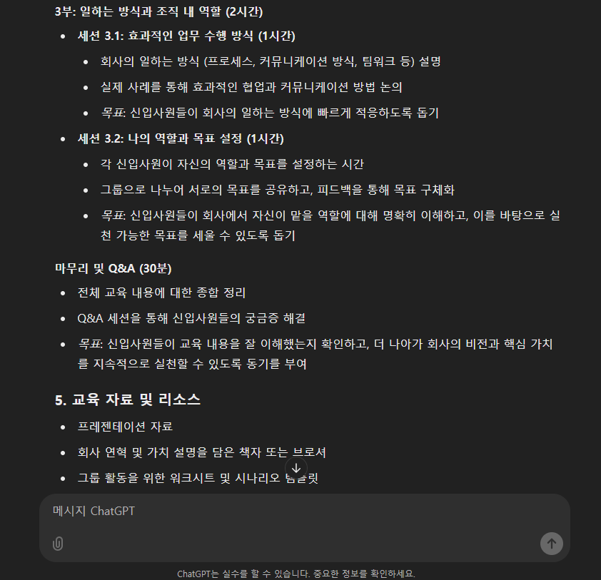 이제 ChatGPT가 제공한 초안을 검토할 차례입니다. GPT는 우리가 참고할 초안을 제공할 뿐, 조직의 니즈와 학습자의 특성 등을 정확하게 이해하고 있는 것은 기업교육 담당자이니 조직 및 학습자의 상황에 적합한지, 각 세션에 할당된 시간이 적절한지, 각 세션의 활동 내용/학습목표 중 조정이 필요한 부분은 없는지 면밀히 검토하는 과정을 반드시 거쳐야 합니다.